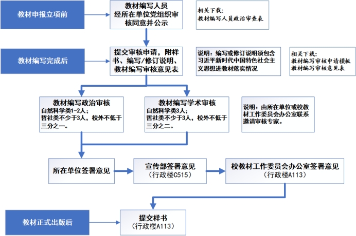 教材建设与使用管理实施办法》,对教材编写人员、编写审核等做出了明确要求。为进一步加强教材建设管理,学校梳理工作流程图和相关表格,供教师使用参考。