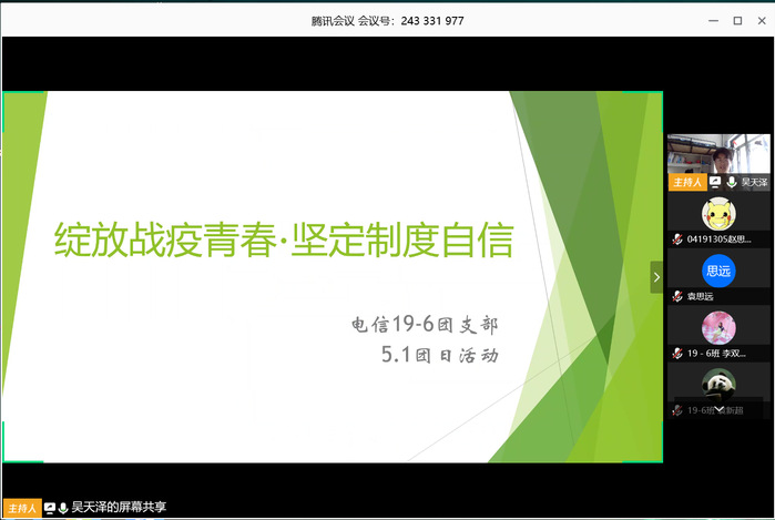 电子信息类19-6班团支部于5月1日开展“绽放战疫青春·坚定制度自信”线上主题团日活动。会议由团支书吴天泽同学主持,班级全体同学参加了会议。