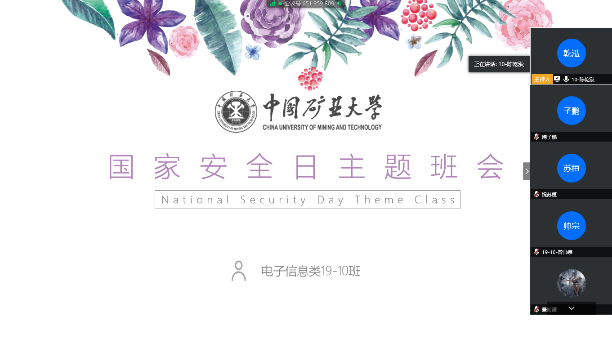 为进一步增强同学们的国家安全意识,提高防范和抵御风险的能力,2020年4月14日,巨乳做爱 电子信息类19-10班召开“415国家安全日”线上主题班会。班长陈乾泓主持会议,,班级全体同学参会。
