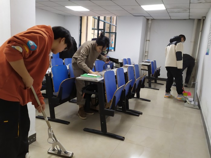 活动期间,志愿者们热情洋溢。到达各自负责的自习室后,志愿者们清扫了地上的纸片与灰尘,整理了桌上杂乱的书籍。在尽量不打扰同学学习的前提下维护教室环境。志愿者们还认真听取自习同学的意见和建议,更有针对性地清理杂物。在志愿者们的共同努力下,自习室的环境焕然一新。