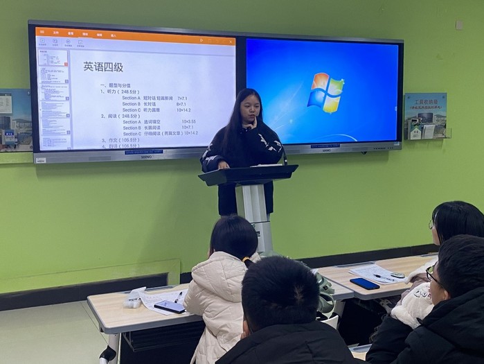 2019级的优秀学子,曾在英语四级考试中取得了667分的好成绩。梅子怡同学向大家详细分析了四级题型、分值等以及分享了自己是如何备考英语四级,向同学们传授提高学习经验和方法。现场的同学们认真聆听,对于存在疑惑的地方积极提问,梅子怡同学与黄子政同学对问题进行耐心地分析、解答,并提出切实的建议。