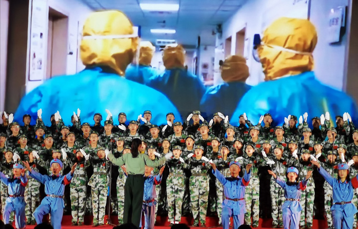 校歌》,伴随着激昂的音乐,合唱队员们精神饱满、放声歌唱,用嘹亮的歌声唱出了同学们对学校的祝福,唱出了学子们对母校的热爱之情。然后合唱《胜利召唤—抗疫版》曲目,“子弟兵,使命扛肩上,向前方,我们和时间赛跑”,唱出了军医们奔赴防疫一线的决心,将新时代青年气魄与胆识淋漓尽致地表现出来。