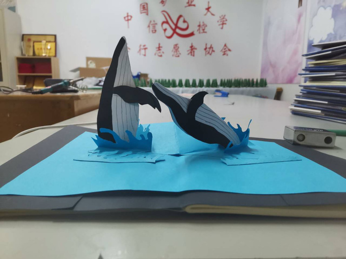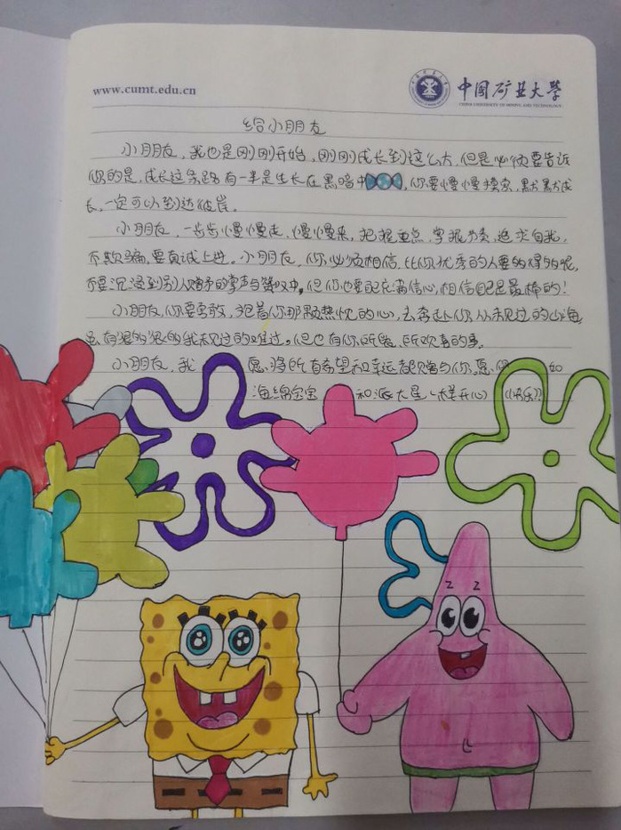 活动方通过公众号、扫楼等宣传方式引起了同学们对参与活动的兴趣。参与者在笔记本扉页上自由创作并写下300字左右的寄语,线下提交至评委处。作品中有些含有鲸鱼立绘,有些含有卡通图画等,传达着矿大学子的温情,传递着对未来的祝福,评委们根据作品的主题立意、构思和美观度三个维度进行评选。活动结束后,这些作品将随笔记本一起送到孩子们的手中。
