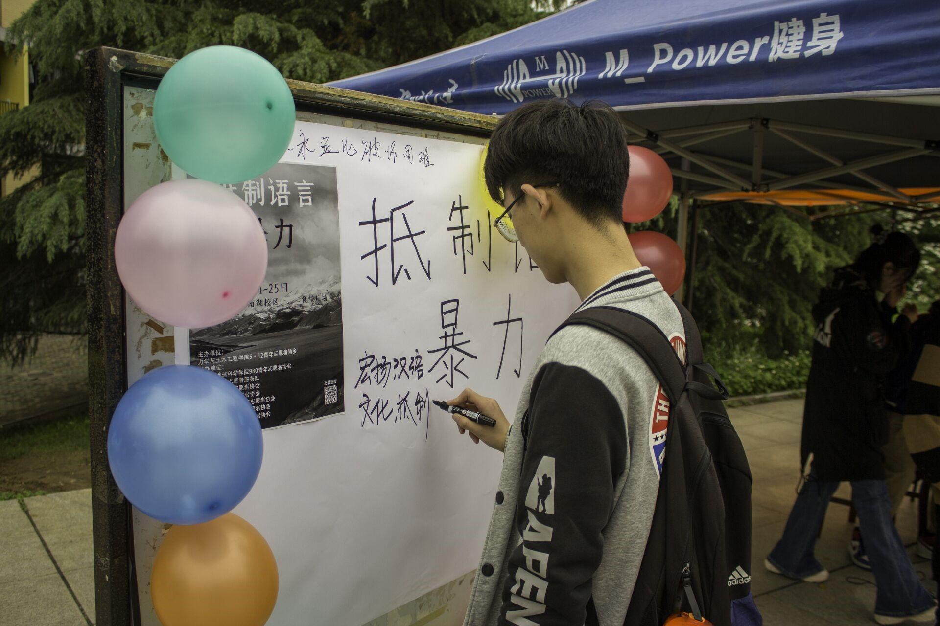 活动参与者踩下事先准备好的气球,里面藏有的符号代表着他们需要完成的任务,符号为“✔”的同学需要在横幅上写下抵制语言暴力的宣言并合影留念,而抽到“✘”的同学则需录制小视频表达对遭受抵制语言暴力者的鼓励。相关人员对路过同学进行随机采访,询问他们有关语言暴力的亲身经历、感受以及对此表达的意见和看法。活动后期,既有在自选卡片上写下抵制语言暴力文字的评奖比赛,也包括3至5人拍摄以“抵制语言暴力”为主题小视频或公益广告的比赛。此外还有相关的征文比赛。作品均发至指定邮箱,并于4月17号截止。参与的各学院负责人一同评奖,最终选出一二三等奖若干名。