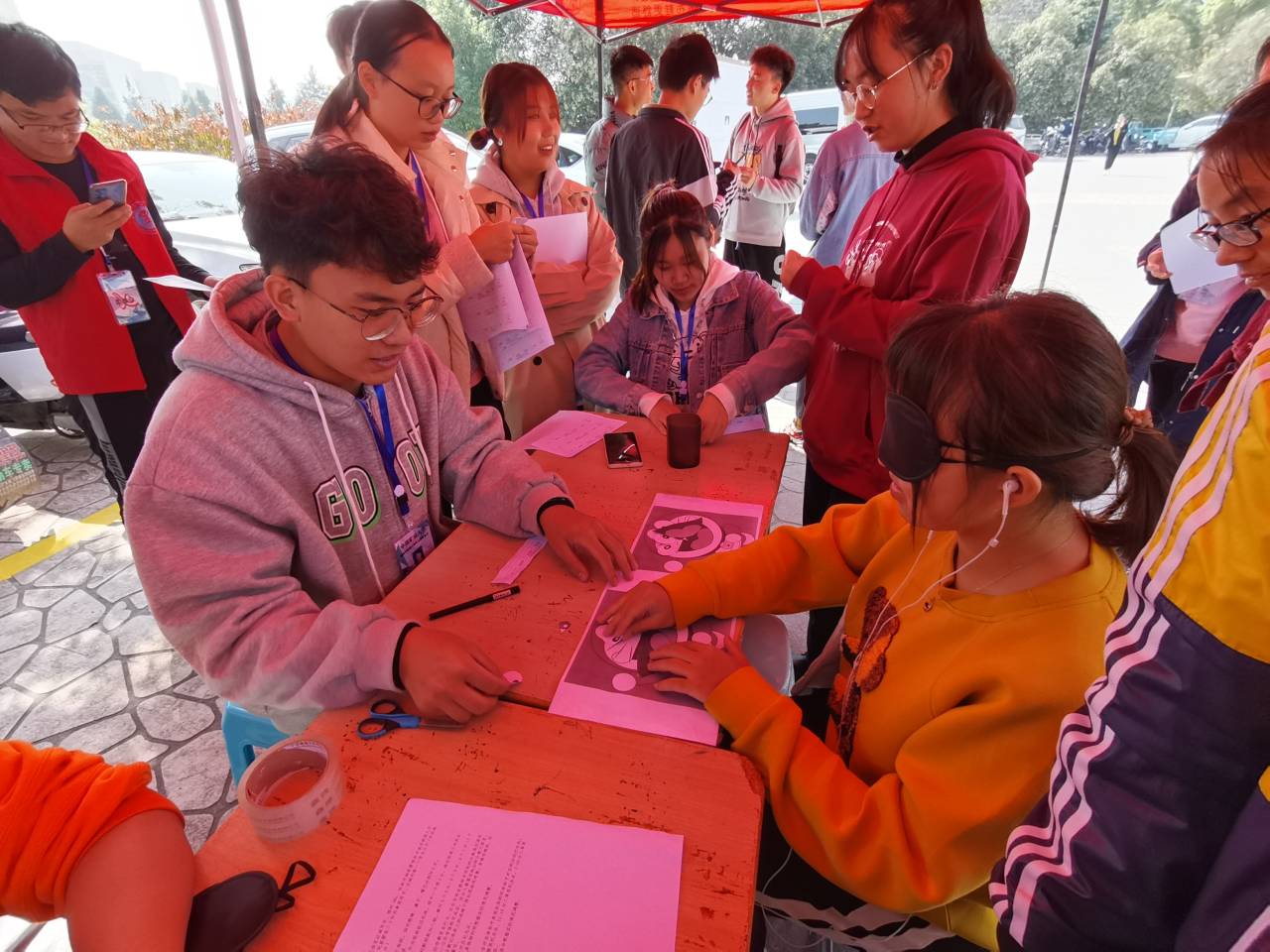 活动在展板区、体验区、感悟区三个区域依次进行。在展板区,志愿者们向同学们介绍了“白手杖节”的渊源,并讲述了视障人士生活里的种种困难。随后,体验区的志愿者们引导同学体验了有关视障人士生活的游戏,如蒙眼写字、蒙眼倒水、蒙眼贴纸、蒙眼投球等。最后,同学们进入感悟区,记录自己体验视障人士生活的感悟。