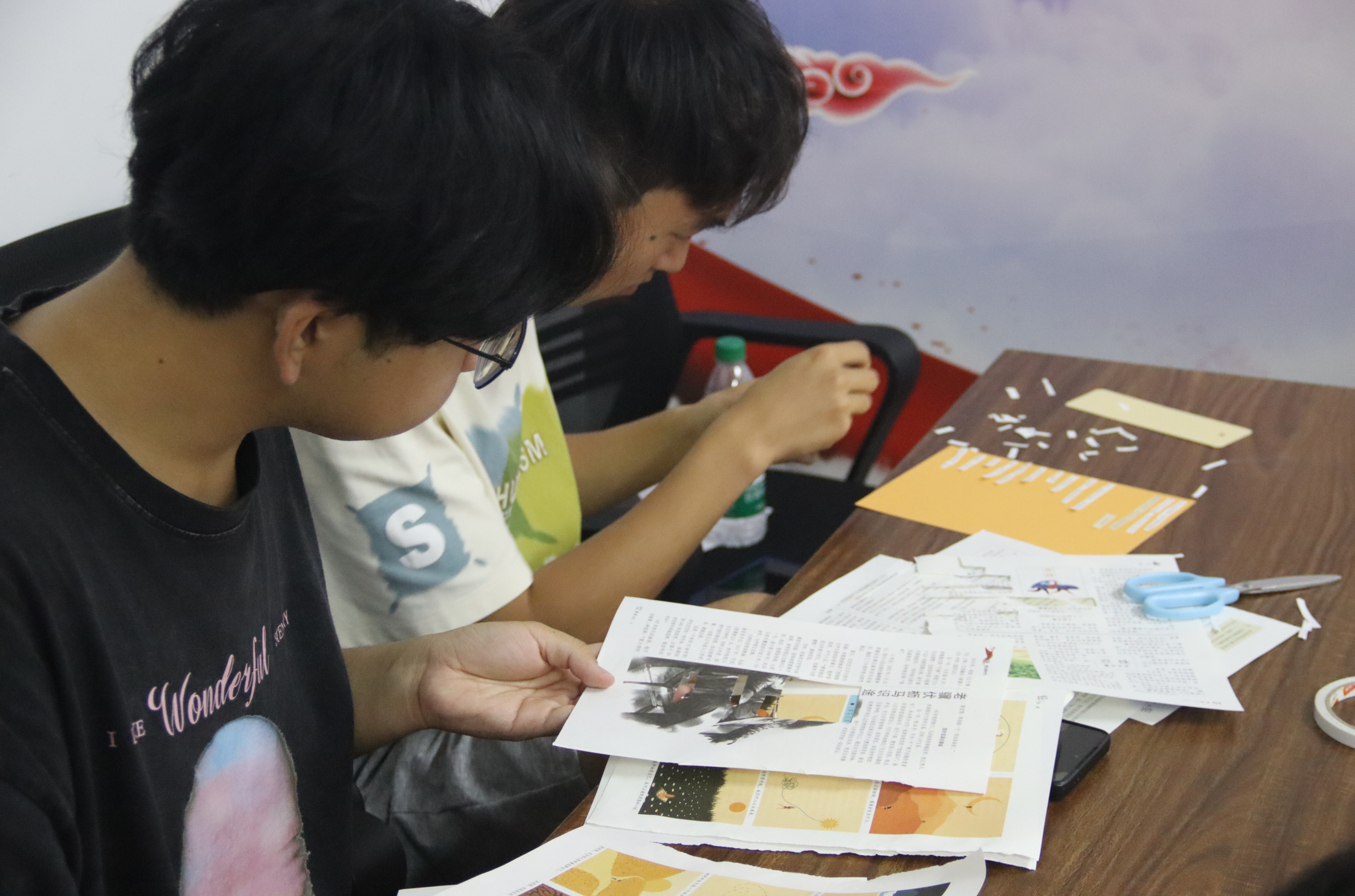 活动主要分为制作书签和拼贴诗两部分。在第一部分中,同学们用画笔在书签上绘制喜欢的图案或文字,有的写下自己喜欢的诗句,有的写下对自己的美好祝愿。在第二部分中,同学们翻阅杂志,剪下其中的一些词语、句子,发挥自己的奇思妙想,将原来的文段进行拆解与重构,粘贴在卡纸上,重新组合出一首首诗歌。在把文字碎片拼贴成诗的过程中,同学们做了一回生活的诗人。在轻松愉快的氛围中,师生之间加深了相互了解的程度。