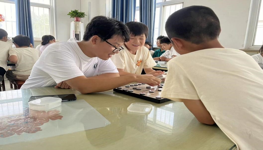 随后正式上课。首先进行的是棋类运动体验课——走进“棋”妙世界。在支教老师的带领下,孩子们围坐一堂,接触并学习了中国象棋、五子棋等棋类运动的基本规则与策略。支教老师通过生动的讲解和实战演示,让孩子们在轻松愉快的氛围中感受到了棋类运动的魅力,不仅锻炼了他们的逻辑思维和判断能力,也激发了他们对传统文化的兴趣与热爱。在讲解完成后,课堂进入了实践部分,孩子们积极与周围的朋友或者支教老师对弈,既锻炼了逻辑思维能力,又进一步加强了孩子们之间的情谊。紧接着,手工折纸课更是将活动推向了高潮。支教团的老师们用普通的彩纸创造出形态各异的作品,在他们的耐心指导下,孩子们在动手实践中不仅锻炼了手眼协调能力,更激发了无限的创造力和想象力,脸上都洋溢着满满的成就感与喜悦。课后大家一起将折的纸飞机放飞,漫天纸飞机飞舞,如同孩子们的未来一样迎风飞翔。