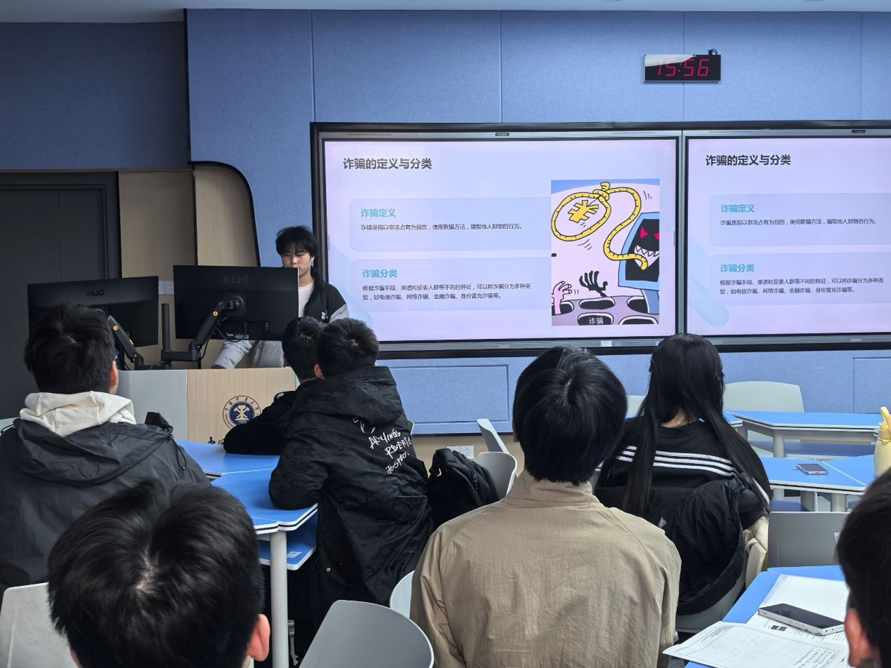 班会伊始,班长梅艺俊详细介绍了当前常见的诈骗手段,如网络兼职刷单诈骗、冒充公检法诈骗、虚假中奖信息诈骗等。随后,他结合校园生活真实案例,讲述了骗子冒充受害人高中同学以精巧的话术实施诈骗,这一案例让同学们深刻认识到诈骗的严重性和隐蔽性。他深入浅出地讲解了诈骗分子的惯用伎俩,这些诈骗手段看似简单,实则防不胜防,稍不留神就可能陷入骗局,让同学们对诈骗有了更清晰的认识。