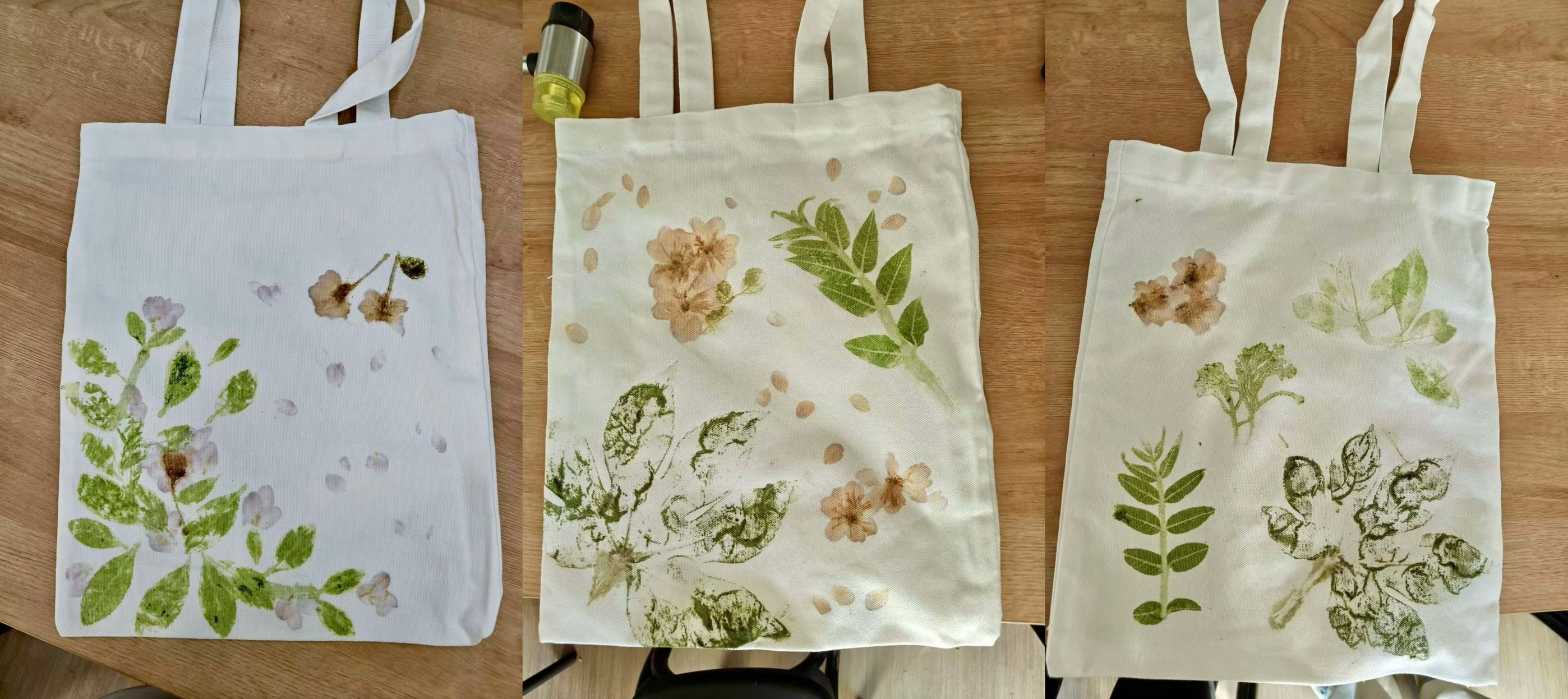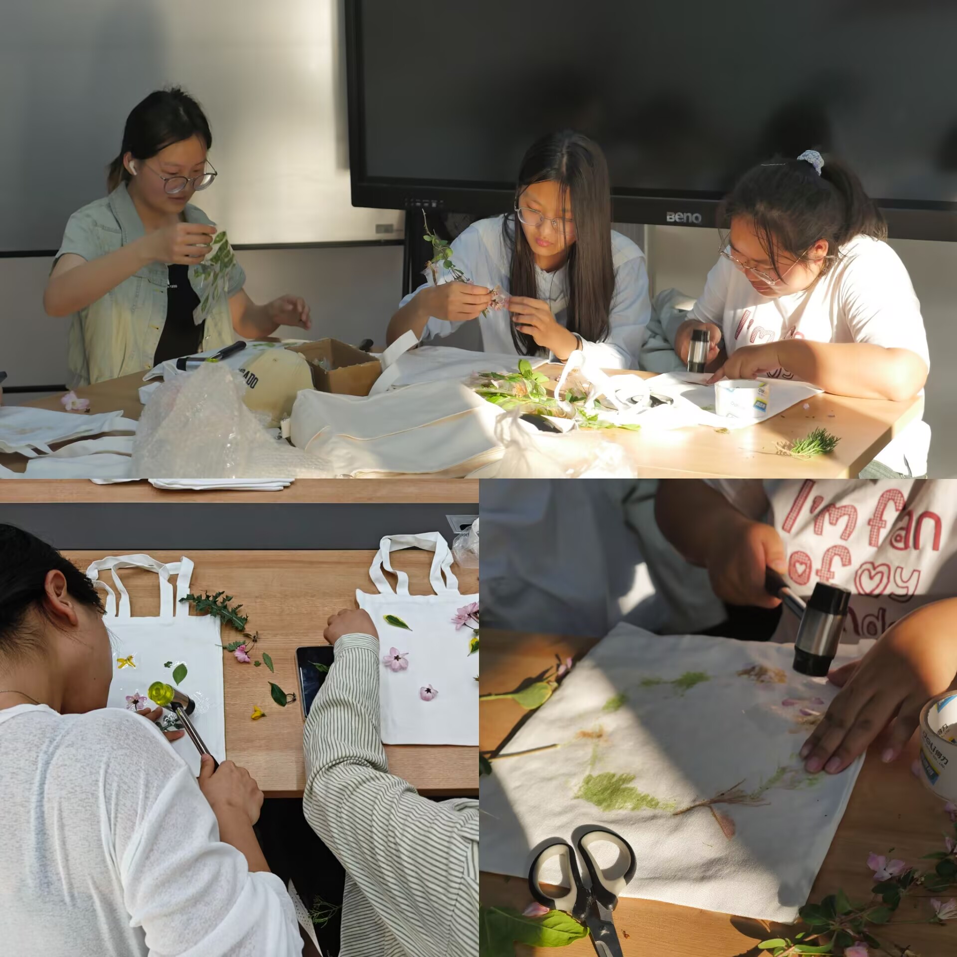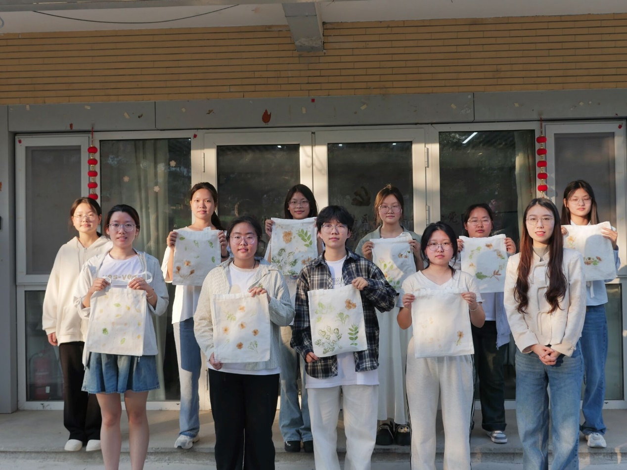 活动现场其乐融融,充满欢声笑语。大家共同观摩视频教程对传统技艺拓印进行了学习。同学们领悟要点后,对收集到的落花、树叶进行了拓印,得到了独一无二且富有春天气息的帆布包。最后,大家携带着活动成品与辅导员老师合影留念,此次活动圆满结束。同学们纷纷表示,在本次活动中切身领会到非遗拓印的魅力所在,既舒缓了学习压力,又领略到盎然的春色。