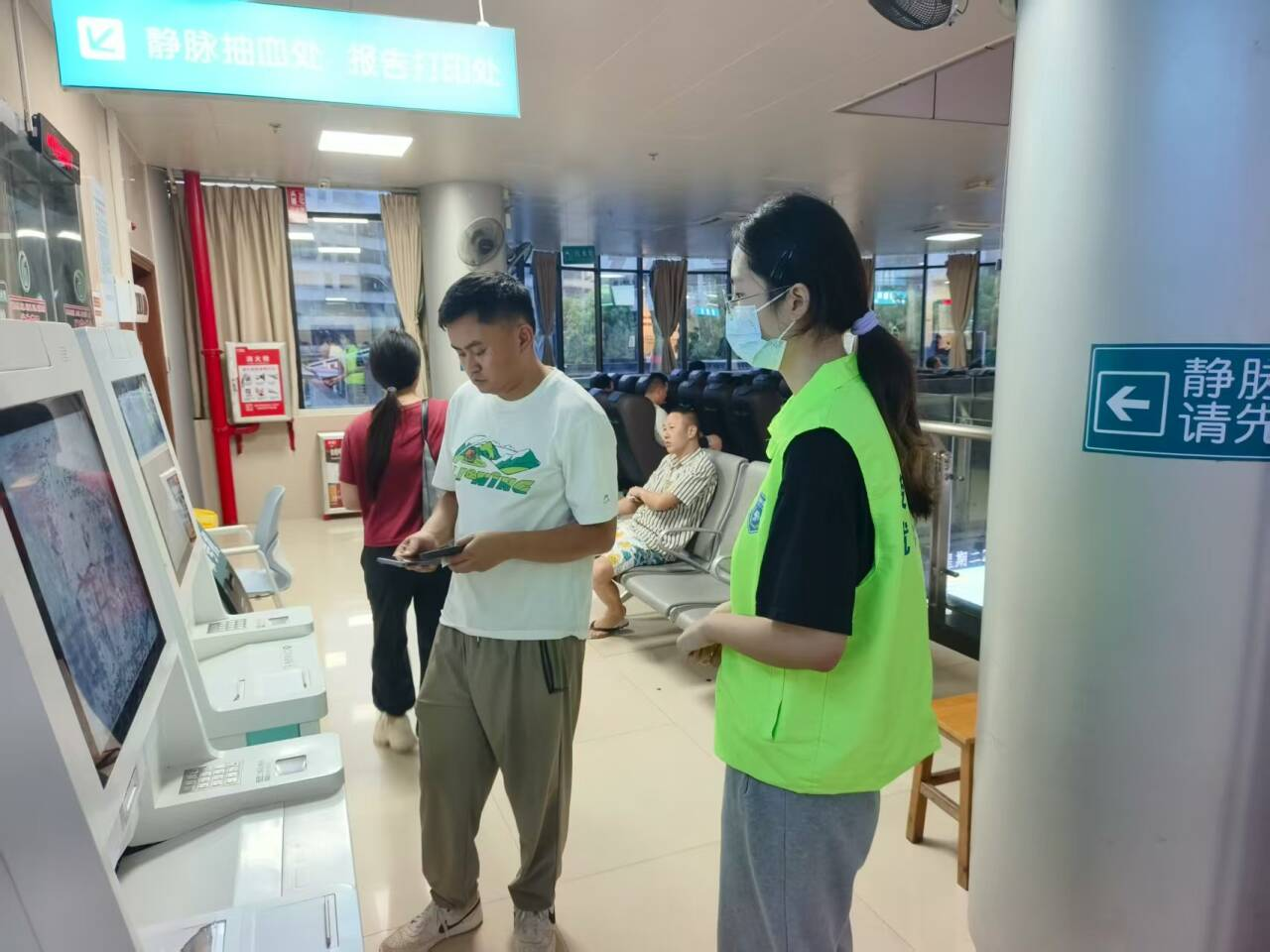 在培训期间,实践团成员学习了医院志愿服务的核心理念、礼仪规范与应急处理知识:从“三米微笑、一米问候”的沟通标准,到熟记科室索引、自助设备操作及轮椅租借流程等。经过培训,团队成员形成“多问一句、多指一步、多陪一程”的服务习惯,为正式上岗奠定扎实基础。培训后,实践团成员被安排在二楼检验科值班,负责引导患者找到正确诊室,帮助患者使用自助打印机等。
