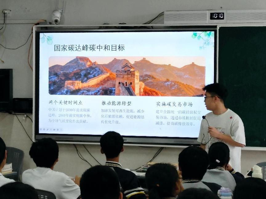 实践队抵达学校后,首先系统介绍了低碳环保的概念,阐释其通过技术与制度创新减少高碳能源消耗、降低温室气体排放,实现经济与生态双赢的内涵。同时成员结合国家碳达峰碳中和的政策目标与苍南县实际情况,解读当地环保政策,让同学们明晰政策与家乡发展、自身生活的关联。