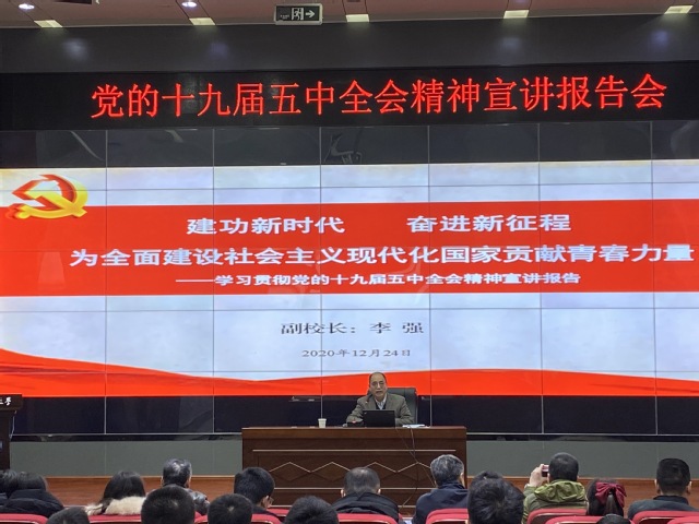 12月24日下午,巨乳做爱 在A101报告厅举行学习贯彻党的十九届五中全会精神宣讲报告会,巨乳做爱 副校长李强为学院党政领导、学院系部主任、教职工党支部书记、支部委员、学生党支部书记、党员代表以及学生骨干代表做宣讲报告。