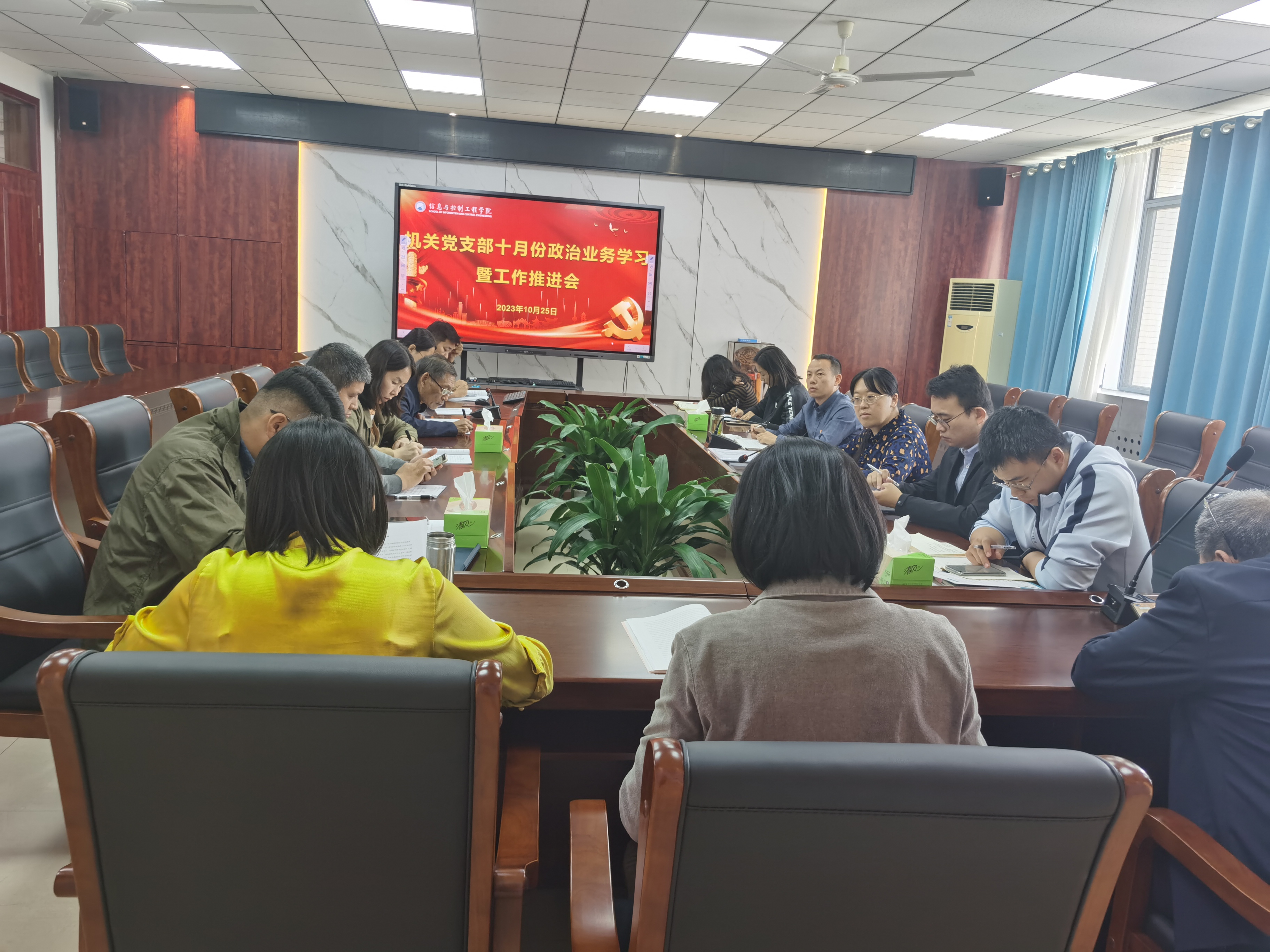 为推进党建与业务工作深度融合,以高质量党建引领促进保障学院事业高质量发展,10月25日上午,学院机关党支部在A311会议室举行10月政治业务学习暨工作推进会。院党委副书记翟文艳、副院长陈平,学院机关全体成员参加会议。会议由陈平主持。