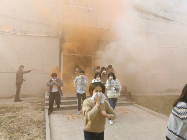 演习前,学院对教师安全员和学生安全员进行了相关工作布置,对全体师生进行了应急疏散逃生安全教育,并对注意事项做了讲解。14时10分,保卫处工作人员在教四楼内模拟释放烟雾并拉响警报,学院教师安全员和学生安全员立即按照制定的预案迅速组织师生疏散逃生。参演的师生根据培训的逃生方法,用湿毛巾捂住口、鼻,按照疏散指示标识和既定的疏散路线,安全有序地疏散到楼外安全区域,表现出了良好的积极避险意识和突发事件自救能力,达到了预期效果。