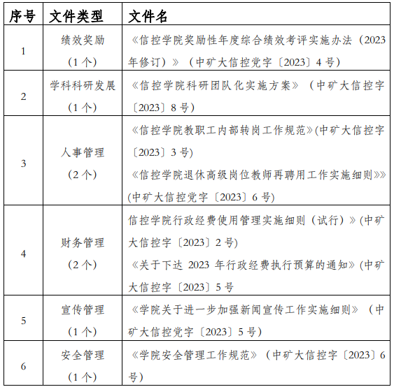 2.推进“长久立”。学院及时固化主题教育中形成的好经验好做法, 运用制度思维破解治理难题,构建“办事依制度、遇事找制度、解决问题靠制度”的运行机制。主题教育期间,学院制定印发了包括绩效奖励、学科科研、人事管理、财务管理、宣传管理、安全管理等文件制度8个,形成了系统完备、科学规范、运行高效的制度体系,建立巩固深化主题教育成果的长效机制。