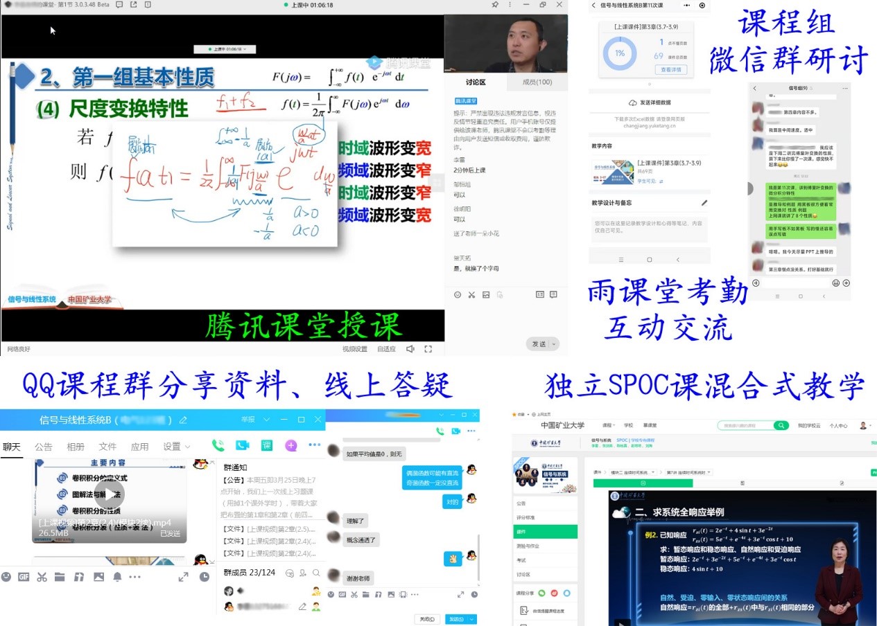 “信号与系统”课程组综合采用多种教学手段进行混合式教学,统一给每位教师配置了摄像头和手写板,结合腾讯课堂和雨课堂按课表开展直播教学,同时依托中国大学慕课自建独立SPOC课程同步进行线上辅导和过程考核(目前选课人数达922人),课前课程组教师在微信群中研讨课程内容、协调教学进度,结合教改自制课程思政视频,并在各个教学QQ群中分享课件、视频等资料,综合SPOC课程讨论区、QQ等进行线上答疑,确保学习效果稳中有升。