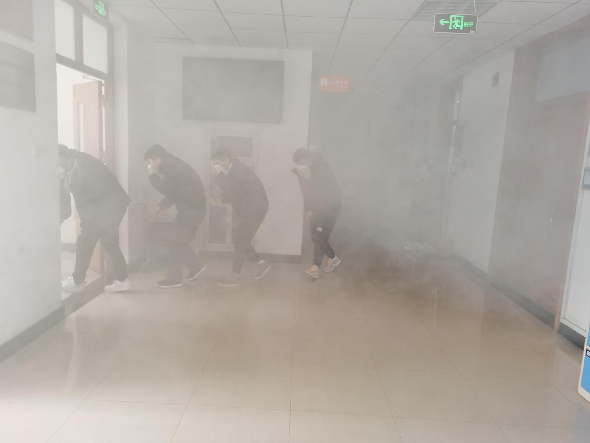 演练开始前,各室负责老师给学生介绍了简单的逃生注意事项和方法,10时00分,演练以学院楼四楼实验中心为模拟火灾地点,分别在相应的模拟位置点燃消防烟雾弹作为起火点。演练现场,浓烟滚滚,面对“突发的火情”,楼内的工作人员迅速到达指定岗位,60多名学生在老师的指引下,用毛巾捂住口鼻,低姿快速有序地按照既定的跳生路线撤离到学院楼外广场。撤离过程中,师生反应敏捷、行动迅速规范、撤离井然有序。