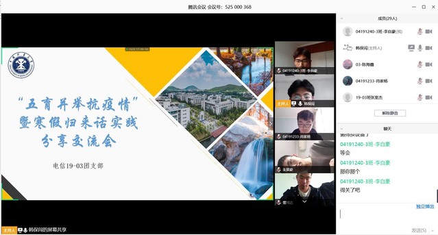 19-03团支部于3月31日下午两点举行“五育并举抗疫情”暨寒假归来话实践的交流分享会。团支书韩保闯主持会议,班级全体同学参加本次会议。