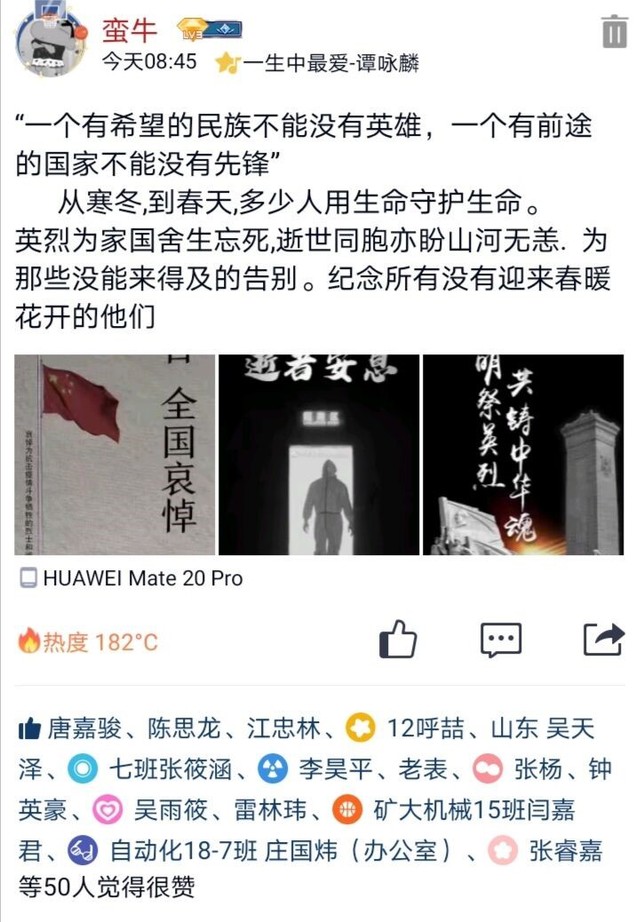 全国高校“百个样板党支部”支部书记李华烁表示向在抗击新冠肺炎疫情斗争中牺牲的烈士和逝世同胞深切哀悼,作为一名中国人,感受到患病逝世同胞面临生死离别时的心酸苦楚和逝者家人无尽的悲痛;感受到抗疫一线英雄们的无私奉献、舍己为人的拼搏精神;感受到举国同心、共克时艰的决心与信念;疫情是对国家的考验,也是对我们每一个中国人的考验,事实证明,我们祖国经得住考验,耐得住磨难,是越挫越勇的。全国上下,举国同悲,铭记历史,面向未来,希望我们的后辈能够铭记这段可歌可泣的历史,化悲痛为力量,用自己的实际行动,为祖国建设、繁荣昌盛贡献自己的力量!