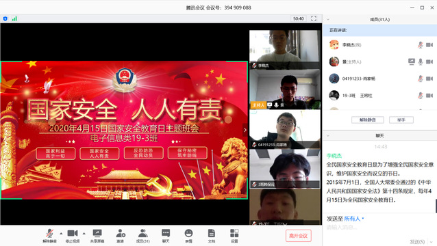 为了深入学习并贯彻落实习近平新时代中国特色社会主义思想和习近平总书记关于国家安全的重要论述,进一步提高学生的国家安全意识,牢固树立总体国家安全观,结合当前疫情防控形势,电子信息类19-3班于414日下午两点通过腾讯会议在线平台举行了“国家安全教育日”主题班会。本次班会由班长朱景豪主持,全班同学参加。