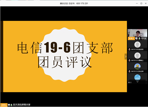 电子信息类19-06班团委开展以“团员评议及寒假社会实践交流”为主题的班会。本次班会由团支书吴天泽同学通过腾讯会议线上主持,班级全体同学参加了班会。