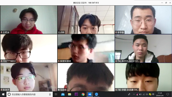 会议伊始,郭源阳老师对身处湖北的同学表示了关心,并提出:“任何同学的任何困难都可以向学校提出,学校会一定程度上解决同学们的困难。”紧接着,郭源阳老师对班级网课出勤情况进行了通报,并对同学们网上学习提出了新的要求。郭源阳老师还进一步分析了目前的疫情形势,提醒同学们做好防疫工作,坚决按照学校要求,严格按照“五个一律”标准。随后,班长庄国华就网格化安排进行了具体讲解,对八位班委提出了疫情期间需要明确网格化职责的要求,并希望每一位同学都能在疫情期间按时上报个人健康情况,同时完成好学校布置的各项学习任务。