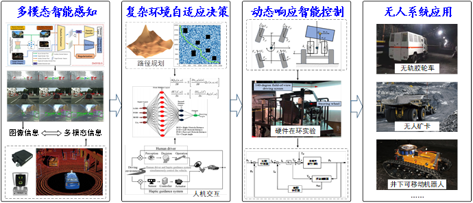 针对无人矿卡、井下可移动机器人等装备存在的信息感知效率低、环境适应能力弱等关键问题,开发了复杂作业环境下的智能感知算法,提高了对阴暗、多尘等特殊环境的检测和识别能力,并提出了智能无人系统自适应决策方法,形成了动态响应智能控制理论,使无人系统能够根据感知信息动态调整作业策略和控制参数,提升了无人系统在复杂环境下智能作业的稳定性和鲁棒性。研究成果为煤矿井下智能巡检、露天矿山高效运输等提供了有力的技术支撑。