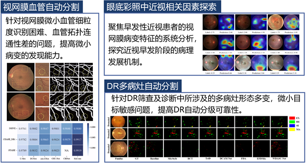 · 眼科:眼底疾病的智能分析对于早期诊断和精准医疗至关重要,能够有效提升疾病筛查的效率和准确性。团队围绕眼底彩照的自动分析开展相关工作。针对视网膜微小血管识别难、血管拓扑连通性差的问题,研究提出深度学习方法提升微小病变检测能力,实现视网膜血管的自动分割。在近视相关因素分析方面,研究聚焦早发性近视患者的视网膜病变特征,探索其病理发展机制,该项目为徐州市医药卫生重点项目,并与徐州市第一人民医院合作开展。此外,研究还针对糖尿病视网膜病变(DR)多病灶自动分割,解决多病灶形态复杂、微小目标敏感等问题,提出自动分级方法,提高DR的检测与分类可靠性。整体而言,该方向结合计算机视觉与医学影像分析,推动眼底疾病的智能诊断,为精准医疗提供重要支撑。
