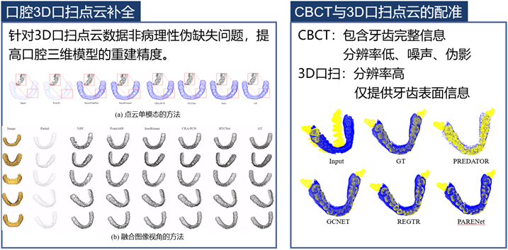 · 口腔科:口腔医学的数字化与智能化对于提高诊疗精度和个性化治疗方案至关重要,能够有效提升口腔模型的重建质量和匹配精度。本研究方向围绕口腔3D数据处理展开,针对3D口扫点云数据病理性伪缺失问题,研究提出点云补全方法,以提高口腔三维模型的重建精度。此外,研究还致力于CBCT与3D口扫点云的配准,结合CBCT的完整牙齿信息和3D口扫的高分辨率表面信息,提升口腔数据的融合精度和重建质量。本项目为自治区东西部联合研发重点项目,由宁夏医科大学总医院与复旦大学合作开展。整体而言,该研究方向结合深度学习与医学影像处理,推动口腔数字化诊疗的发展,为精准医疗提供重要支撑。